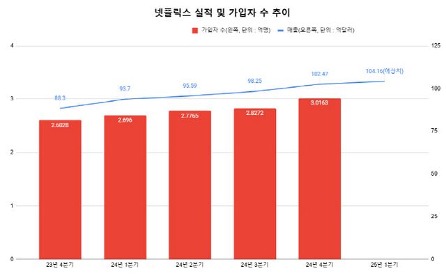 넷플릭스의 실적 증가를 이끈 것은 가입자 수 증가다. 2024년 12월 말 기준 가입자 수는 3억 163만명으로 처음으로 3억명을 넘어섰다. 2024년 4분기에만 1891만명이 늘어 분기별 가장 많이 가입자가 늘었다. 시장 예상치의 2배다. 넷플릭스의 이전 최대 분기별 가입자 기록은 코로나19 팬데믹 초기였던 2020년 1분기 1500만명이었다. 넷플릭스는 이번 분기 이후로는 더 이상 가입자 수를 발표하지 않는다.
