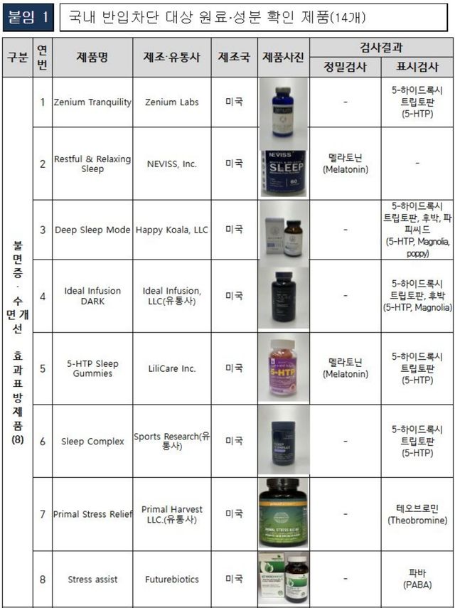 검사 결과, 불면증·수면장애 개선 효능을 표방한 8개 제품과 항우울·항불안 효능을 표방한 6개 제품에서 의사의 처방이 필요한 전문·일반 의약품 성분이나 식품 원료로 사용할 수 없는 위해 성분이 발견됐다.