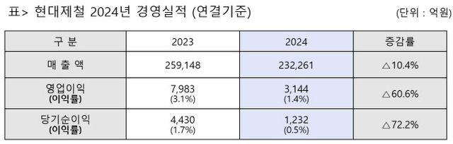 현대제철(004020)은 22일 공시를 통해 지난해 연결기준 매출 23조2261억원, 영업이익 3144억원, 당기순이익 1232억원을 기록했다고 밝혔다. 매출은 전년 대비 10.4% 감소했으며 영업이익과 당기순이익도 각각 60.6%, 72.2% 큰 폭으로 감소했다.