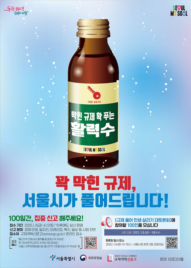 서울 시민들이 자유로운 경제 활동과 편안한 일상을 누릴 수 있도록 도와줄 100일 집중신고제. 1월 3일부터 4월 12일까지 100일간 운영되는 만큼 일상 속 불합리한 규제를 발견했거나 직접 경험한 적이 있다면 망설이지 말고 규제개혁신문고에 신고하길 바란다.