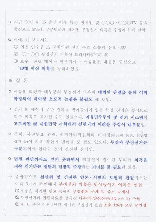 특히 “법원 판단까지도 믿지 못하면서 의혹을 지속 제기하는 집단의 일방적 주장과 거리를 둘 필요가 있다”며 “선관위 및 건전한 언론·시민의 보편적 관점에서 부정선거 의혹을 받아들이기 어려운 현실”이라고 결론내렸다.