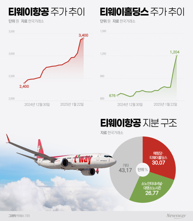 주가 상승의 주요 배경으로는 대명소노그룹의 티웨이항공 인수를 공식화 했기 때문이다. 소노인터내셔널은 지난 20일 티웨이항공과 정홍근 대표이사를 대상으로 ▲경영진의 전면 교체 ▲티웨이항공의 안정적 운영을 위한 유상증자를 요구하는 경영개선요구서 전달했다. 또한 지난 21일에는 오는 3월 예정된 정기 주주총회 의안 상정을 위한 주주제안 전달과 주주명부 열람등사를 요청했다.