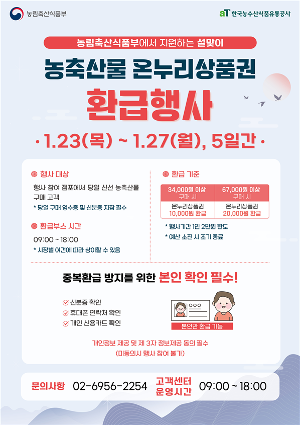 이 기간 동안 전통시장에서 국산 농수축산물을 구매하면, 최대 30%까지 온누리상품권으로 환급받을 수 있다. 농축산물은 1인당 최대 2만 원, 수산물은 2만 원까지 환급 한도가 주어진다.