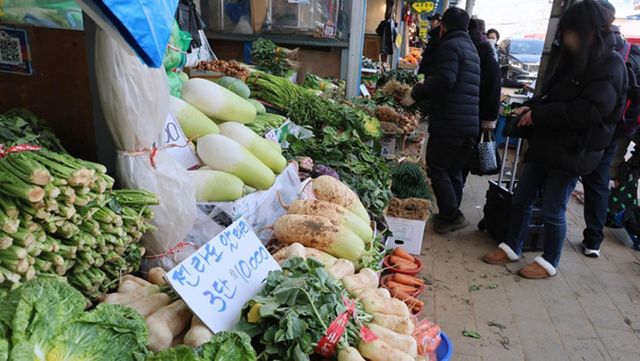 시민들이 22일 서울 동대문구 청량리종합시장에서 무 등 채소를 둘러보고 있다. / 연합뉴스