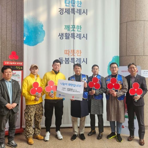 22일 수원시청 본관 로비에 설치된 사랑의 온도탑 앞에서 열린 기부 물품 전달식에는 박래용 수원블루라이온스 클럽회장, 새마을푸줏관 관계자, 수원시 관계자 등이 참석했다.