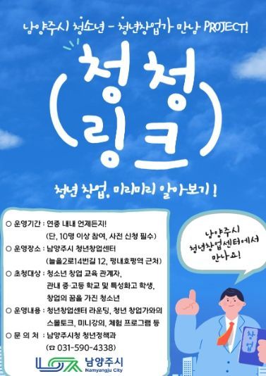 [와이뉴스] 남양주시는 2월부터 청년창업센터에서 청소년과 청년 창업가 간 소통 창구인 ‘청청-링크’ 프로그램을 운영한다고 22일 밝혔다.