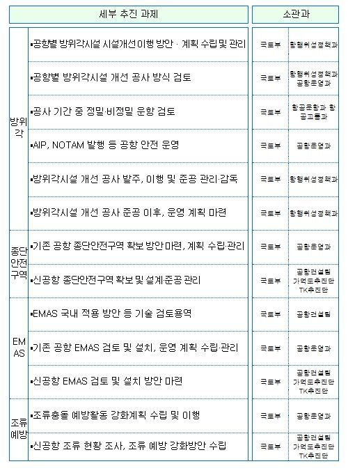 또한, 공항시설을 상시 관리·점검하는 체계를 구축토록 공항개발기술심의위원회에 안전 전문가 보강, 분기별 공항시설 안전점검 시행, 시설 안전 업무를 전담하는 공항시설 안전팀(가칭) 신설 등도 추진한다.