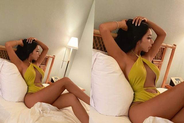 공개된 사진 속 허애선은 라임 컬러 모노키니를 입고 침대에 누워 있는 모습이다. 가슴 중앙부터 배꼽까지 확 트여 있는 과감한 수영복을 소화한 허애선은 언뜻봐도 입체적인 글래머 자태로 시선을 강탈했다.