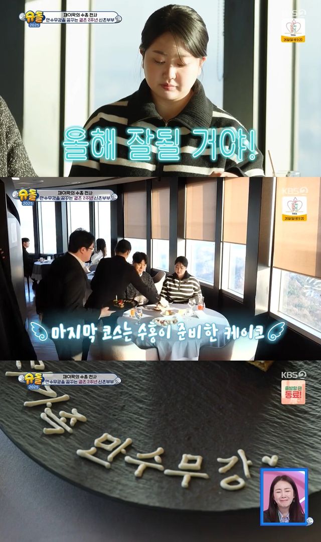이날 박수홍은 결혼기념일을 기념해 케이크를 준비했다. 케이크에는 '우리가족 만수무강'이라는 글귀가 적어져 있어 모두를 웃게 하기도 했다. 이를 본 김다예는 "올해 잘될거야"라면서 "무탈하게 건강하게만 행복하자"고 말했다.