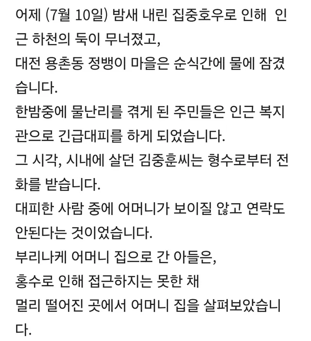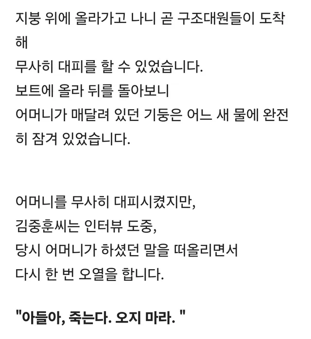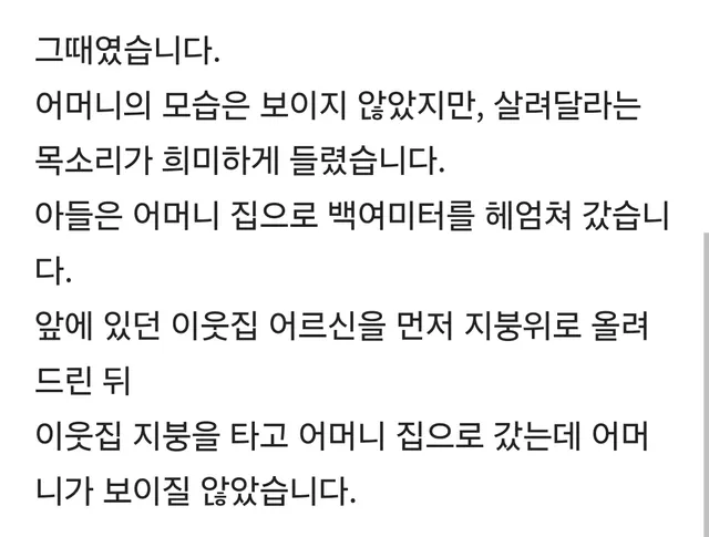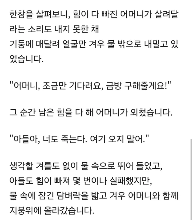 집중호우로 침수된 마을에서 어머니가 아들한테 한 말