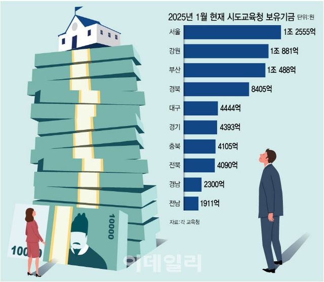 전국 시도교육청에 따르면 올해 기준 교육청 17곳이 세입 감소에 대비해 모아둔 재정안정기금은 총 3조 5362원이며 시설 개선에 쓰기 위해 모아둔 시설기금은 3조 630억원이다. 여기에 기타(정보화·통폐합·폐교활용)기금 7772억원까지 합하면 총 7조 3763억원의 기금을 쌓아두고 있다.