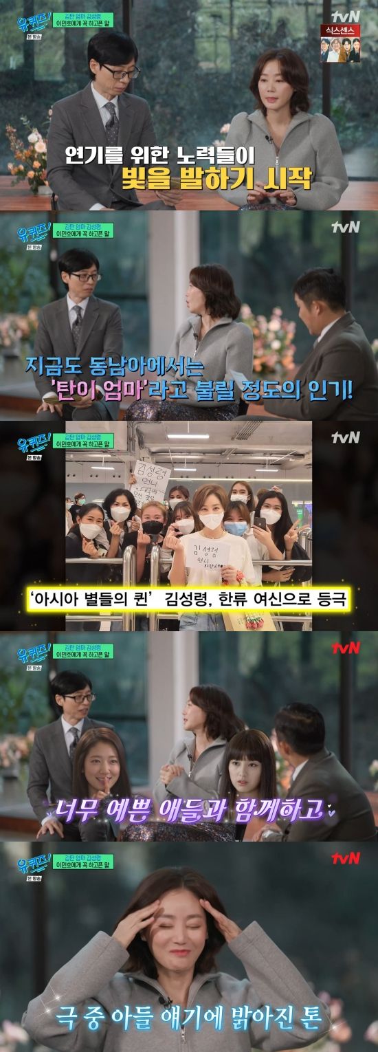 조세호는 "동남아에서는 지금도 탄이 엄마라고 불릴 정도다"라며 귀띔했고, 유재석은 "작품 속에서 김성령 씨의 존재감이라든가 연기들이 굉장히 많은 분들에게 사랑을 받기 시작했다"라며 감탄했다.