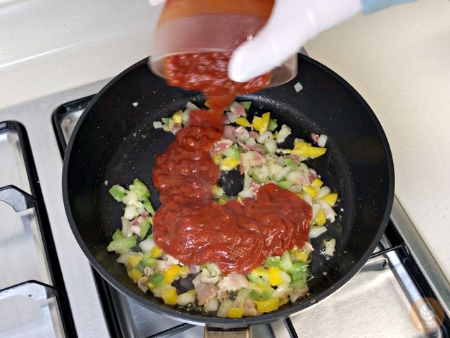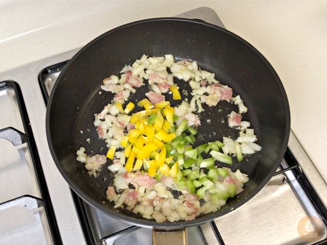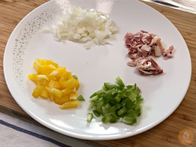 양파, 베이컨, 피망, 파프리카는 먹기 좋게 썰어요.