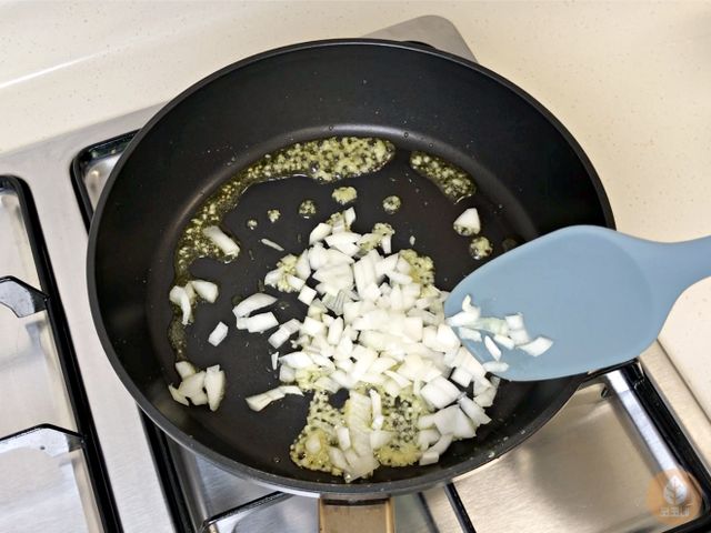 마늘향이 충분히 올라오면 양파를 넣고 볶아요.