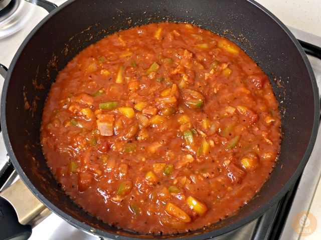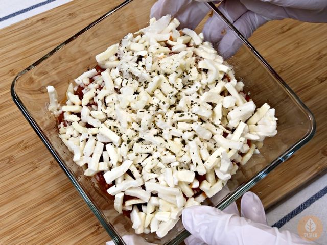 재료가 잠길랑말랑하게 토마토소스 붓고