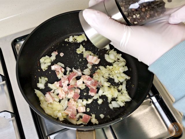 베이컨 넣고 후추 톡톡 뿌려서 볶아주세요.