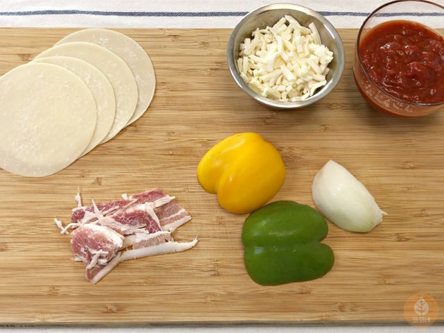 재료는 만두피, 모짜렐라치즈, 토마토소스, 베이컨,