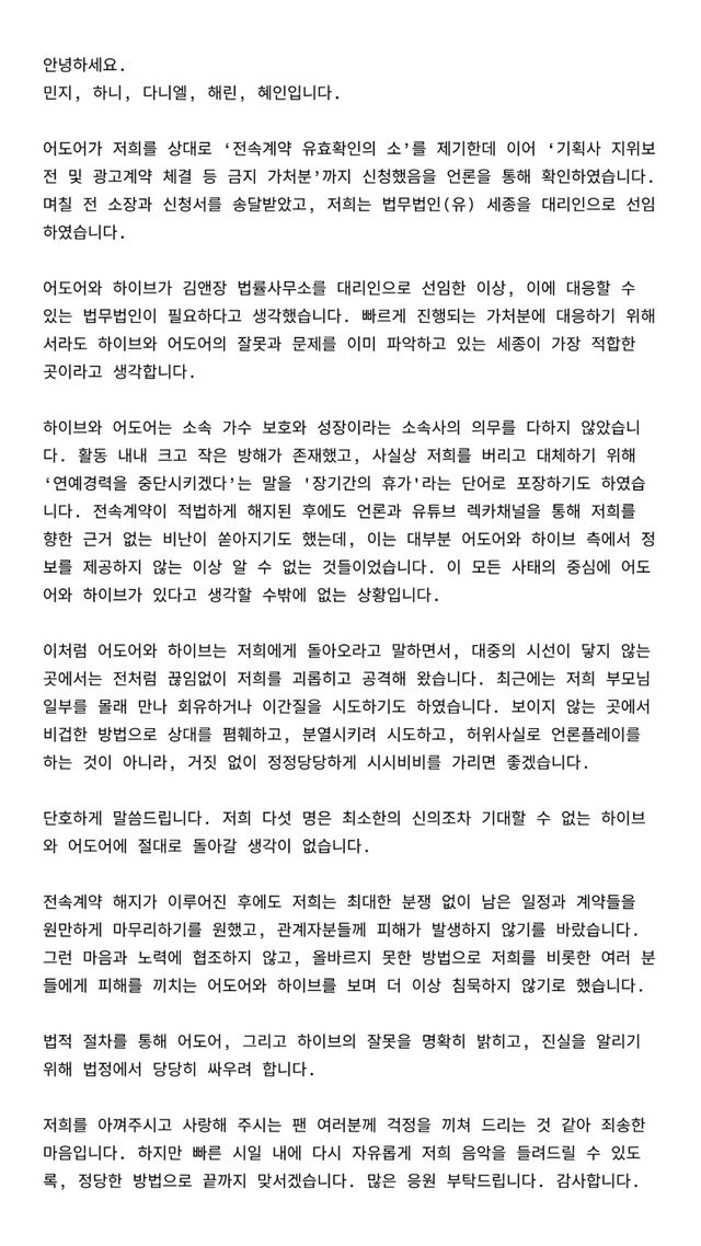 멤버들은 이러한 상황에 대해 "며칠 전 소장과 신청서를 송달받았고, 저희는 법무법인(유) 세종을 대리인으로 선임하였다"라며 "빠르게 진행되는 가처분에 대응하기 위해서라도 하이브와 어도어의 잘못과 문제를 이미 파악하고 칬는 세종이 가장 적합한 곳이라고 생각했다"라고 전했다.