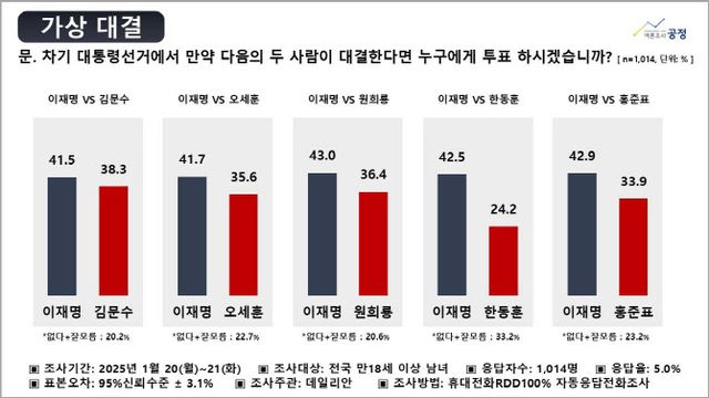 이재명 대표와 김문수 장관이 맞붙을 경우에 관한 질문에 응답자의 41.5%는 이 대표를 선택하고 38.3%는 김 장관을 선택하며 3.2%포인트의 오차 범위 내 접전을 벌이는 것으로 나타났다. 이외 ‘지지 후보 없다’를 택한 응답자는 15.6%, ‘잘 모르겠다’고 답한 응답자는 4.6%였다.