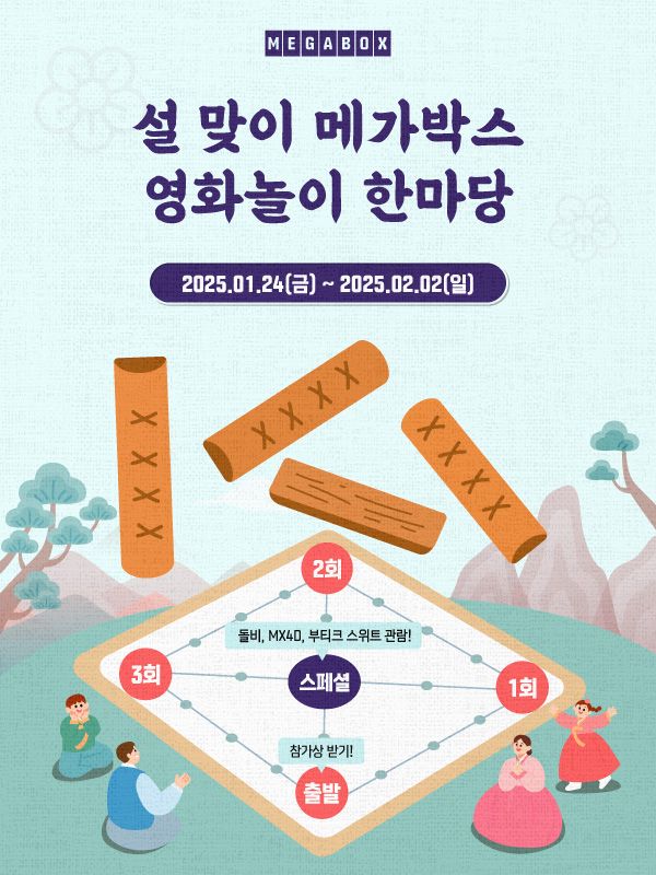 메가박스가 설날 연휴를 맞아 오는 24일부터 내달 2일까지 ‘메가박스 영화놀이 한마당’ 이벤트를 진행한다. 참여만 하면 3인 이상 영화 예매 시 30% 할인하는 쿠폰 등을 증정한다.
