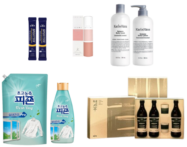 ‘백세주 VIP 선물세트', 피죤 '초고농축피죤 실내건조 Pro 프레시데이(좌측 상단부터 시계방향