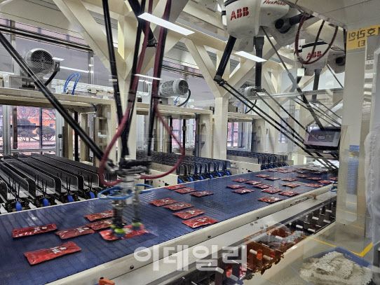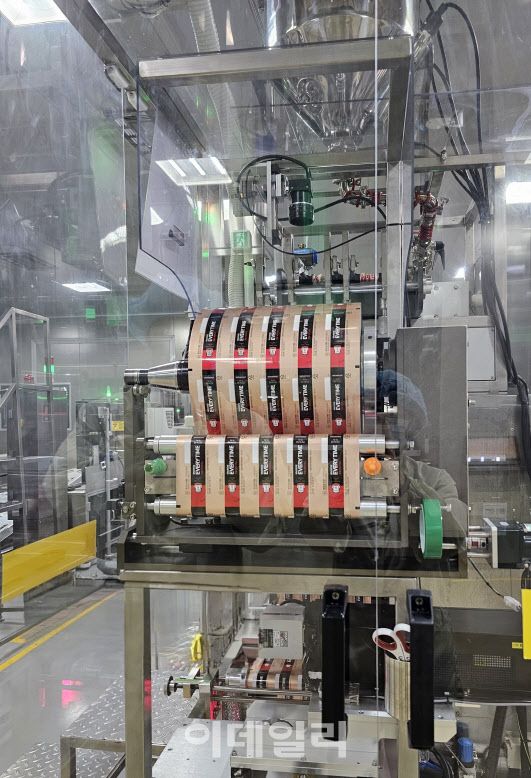 특히 기자가 직접 바로 옆에서 지켜본 충전·포장 공정은 ‘쉬이잉’, ‘철컥철컥’, ‘솨’ 등의 기계음을 쉴 새 없이 내는 자동화라인의 향연이었다. 자동화 덕분에 파우치 충전 4개 라인, 스틱 충전 3개 라인 등 총 12개 충전라인에서 일일 최대 130만포까지 홍삼 배합액을 파우치에 담아냈다. 압권은 거미줄같이 뻗은 팔로 컨베이어벨트 위에 놓여 지나가는 홍삼 파우치를 빠르게 집어올려 포장하는 ‘델타로봇’이었다. 이 로봇은 시간당 4만2500포까지 포장이 가능하다.