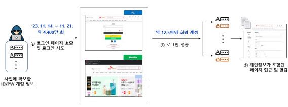 개인정보위 조사 결과, 해당 기간 해커는 SK스토아 웹사이트에 국내외 14개 아이피(IP) 주소를 통해 1초당 최대 372회, 총 4400만번 이상 대규모로 로그인을 시도했다. 공격 기간 일평균 로그인 시도 건수는 평시 대비 1092배 높은 것으로 나타났다. 이 중 12만5000여개 회원 계정으로 로그인에 성공해 개인정보가 포함된 웹페이지에 접근한 것으로 확인됐다.