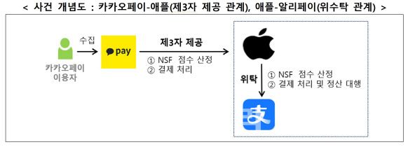 또한 애플의 위수탁 사업자 알리페이에는 카카오페이 이용자의 ‘NSF(Non Sufficient Funds Score) 점수 산출 모델’을 파기하도록 시정명령했다. NSF는 애플 서비스 내 여러 건의 소액결제를 한 건으로 묶어 일괄 청구하는 경우, 자금부족 가능성 등을 판단하기 위한 이용자별 점수다.