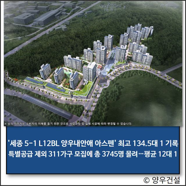 양우건설이 세종특별자치시 5-1생활권에 공급하는 '세종 5-1 L12BL 양우내안애 아스펜'이 1순위 청약에서 최고 134.5대 1의 경쟁률을 기록했다.