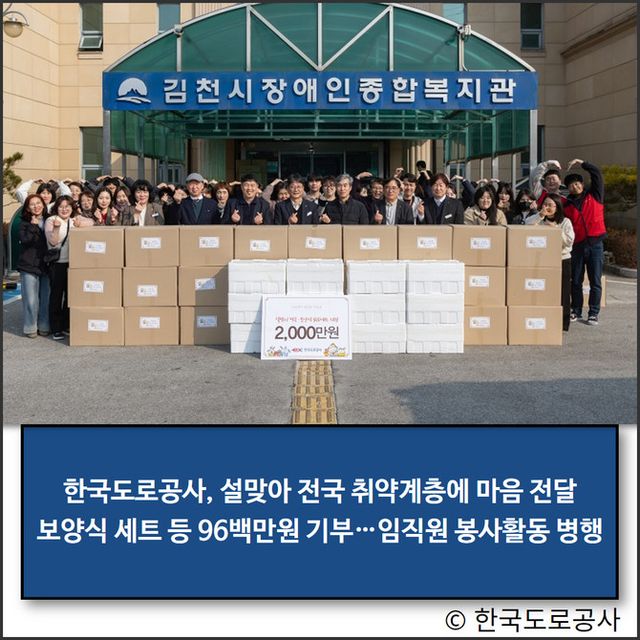 한국도로공사가 설 명절을 맞아 전국 취약계층에게 총 96백만원 상당의 물품을 기부하고 봉사활동을 전개한다.