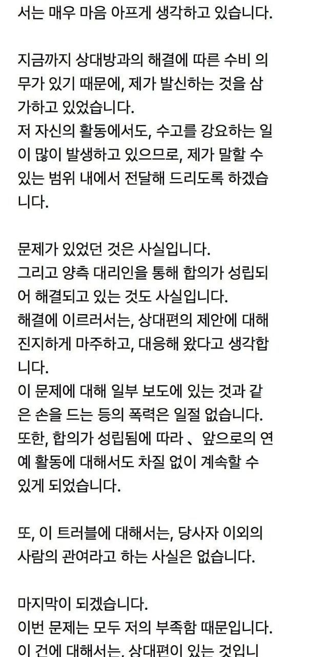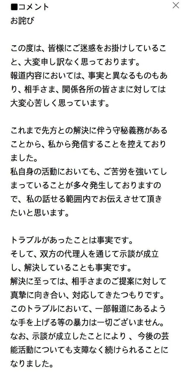 또한, 합의가 성립됨에 따라, 앞으로의 연예 활동에 대해서도 차질 없이 계속할 수 있게 되었습니다.