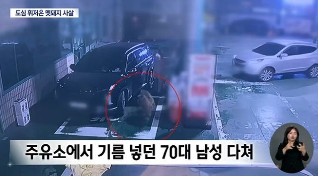 대구MBC가 공개한 CCTV 영상에 따르면 멧돼지는 주유소 안에서 차에 기름을 넣고 있는 사람들 주위로 빠르게 지나갔다. 이어 주유 중이던 70대 A씨를 향해 내달린 멧돼지는 미끄러지면서 A씨와 부딪혔다.