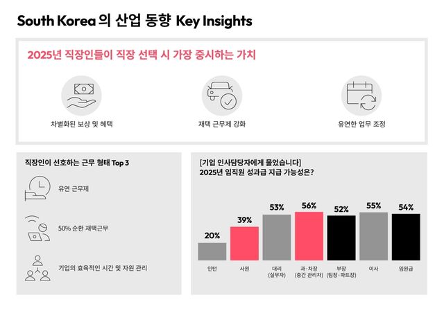 글로벌 채용 컨설팅 기업 로버트 월터스 코리아가 지난 14일 발표한 ‘2025 디지털 연봉조사서’에 따르면 구직자 및 재직자가 선호하는 복지 혜택으로 ‘성과급(74%)’과 ‘유연 근무(48%)’, ‘원격 근무(33%)’가 꼽혔다. 재택 근무 축소 시 이직을 고려하겠다는 의견도 있었다.