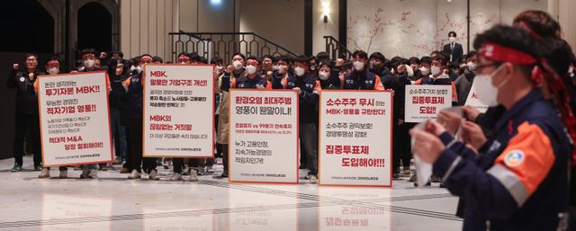 한편 임시 주총이 열린 그랜드하얏트호텔 로비는 이른 아침부터 고려아연과 영풍·MBK파트너스 측 관계자, 회사 직원들로 북적였다. 고려아연 노조원들은 입구 앞에서 ‘투기자본 MBK’, ‘집중투표제 도입’, ‘국가핵심기술을 지키자’ 등의 문구가 써진 피켓을 들고 적대적 인수합병(M&A)을 반대한다고 목소리를 높이며 시위 활동을 펼치기도 했다.