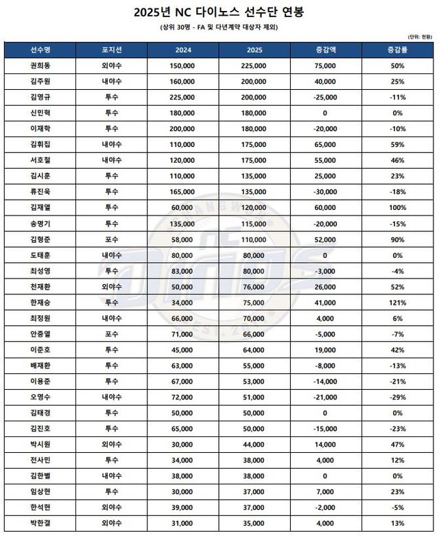 NC는 23일 2025년 연봉 계약 현황을 발표했다.