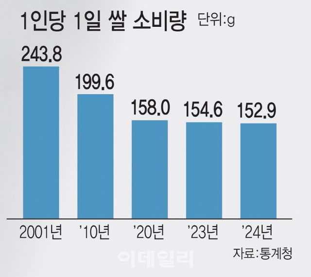 1인당 하루 소비량으로 환산하면 152.9g이다. 전년대비 1.7g 줄었다. 쌀을 밥으로 지었을 때 수분량을 포함해 두 배 정도 불어난다는 점을 감안하면 하루에 즉석밥(300g 기준) 1개의 양만큼만 먹는 셈이다. 연도별로는 1964년 329.3g이던 쌀 소비량은 2010년 199.6g으로 200g 아래로 떨어졌고 2020년 들어서는 150g대로 진입해 계속 감소하는 추세다.