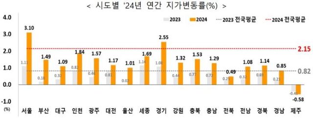 반면 지난해 전국 평균 지가는 2.15% 상승했으며, 지역별로도 수도권(1.08%→2.77%)과 지방(0.40%→1.10%)에서 모두 전년보다 높은 수준을 보였다.