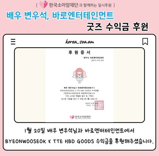 23일 한국소아암재단 공식 계정에는 "1월 20일 배우 변우석님과 바로엔터테인먼트에서 BYEONWOOSEOK X TTE HBD GOODS 수익금을 후원해주셨습니다"라는 글을 게재하며 후원 증서를 공개했다.