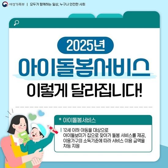12세 이하 아동을 대상으로 아이돌보미가 집으로 찾아가 돌봄 서비스를 제공, 이용가구의 소득기준에 따라 서비스 이용 금액을 차등 지원
