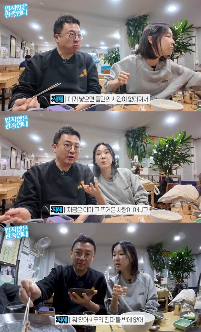 이어 이지혜는 함께 밥을 먹던 한 지인에게 "애기 낳기 전에 많이 누려야 한다"고 조언했다. "애기 낳으면 둘만의 시간이 없어져서 좀 많이 다투긴 한다"고 덧붙였다. 그는 문재완과의 관계에 대해 "지금은 이미 그 뜨거운 사랑이 아니고 은은한 사랑"이라고 말하면서도 "인생 뭐 있어, 우리 둘밖에 없어"라고 말하며 문재완과의 애정을 과시했다.