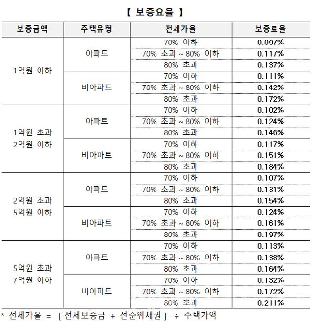 HUG는 아울러 9천만원 이하, 9천만원 초과 ∼ 2억원 이하, 2억원 초과로 나뉘던 전세 보증금 분류도 △1억원 이하 △1억원 초과∼2억원 이하 △2억원 초과∼5억원 이하 △5억원 초과∼7억원 이하의 4단계로 세분화했다.