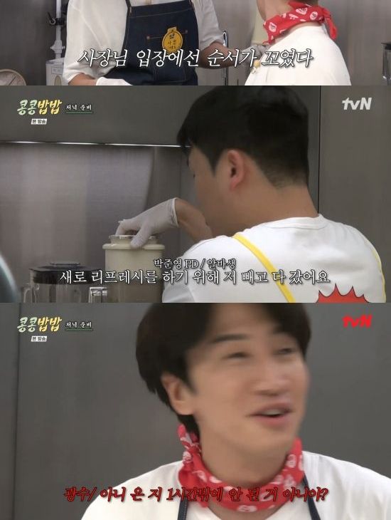 이광수는 "양배추 먼저 시작해야 되는 거 아니야?"라며 만류했고, 박준영 피디는 "누구 말을 들으면 되냐"라며 곤란해했다. 이광수는 "제가 사장이니까. 제가 서열 1위니까"라며 큰소리쳤고, 결국 양배추 손질을 박준영 피디에게 맡기고 자신이 양파를 볶았다.