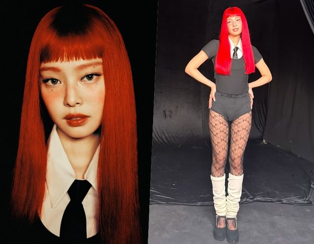 공개된 사진 속 제니는 뱅 헤어스타일에 빨간색 헤어 컬러의 긴 머리를 내려뜨린 강렬한 모습이다. 이에 넥타이에 셔츠 그리고 블랙 반발티셔츠에 마이크로 핫팬츠를 매칭해 강렬한 자태로 시선을 사로잡는다. 그의 스타킹 역시 망사를 연상케하는 남다른 비주얼로 스타일링까지 놀라움을 더한다.