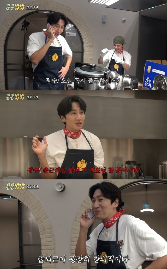 구내식당 점심 준비에 앞서 이광수는 '에그이즈커밍' 사우들에게 연락을 시도했다. 그러나 늦게 출근하고 늦게 퇴근하는 회사 특성상 나영석은 "이 시간에 애들은 자고 있을 것"이라고 고개를 갸웃거렸다.