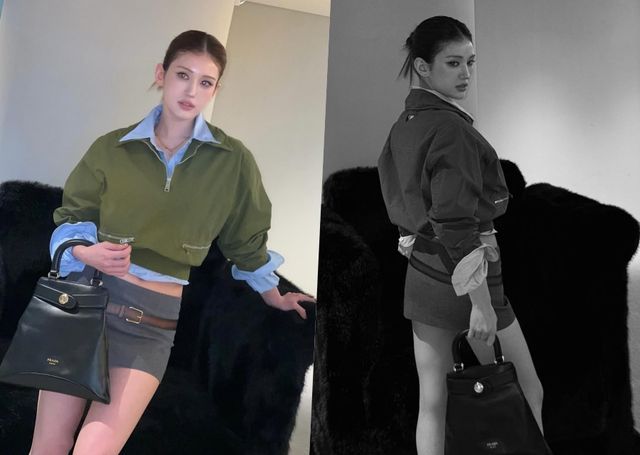공개된 사진 속 전소미는 올백으로 심플하게 헤어스타일을 정리하고 짙은 메이크업으로 강렬한 인상을 더했다. 그레이톤의 미니 스커트에 카키톤의 크롭 상의를 입은 전소미는 마치 치마가 절개되있는 듯한 착시 밸트 포인트로 남다른 센스를 더한다.