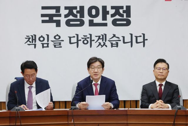 권성동 국민의힘 원내대표는 24일 국회에서 열린 원내대책회의에서 이 대표의 전날 기자회견에 대해 "처음부터 끝까지 단 한줄도 믿을 수 없다"고 말했다.
