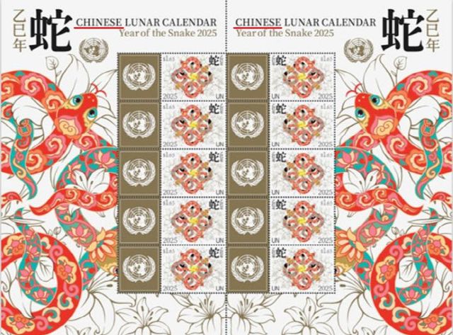 해당 우표를 보면 상단에는 ‘중국설 우표’(Chineses Lunar Calendar)라고 적혀 있으며 을사년 뱀의 해를 맞아 뱀이 형상화된 모습과 유엔 로고가 적혀 있다.