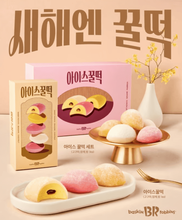배스킨라빈스는 설을 맞아 명절 대표 디저트인 '떡'을 현대적으로 재해석하고 '꿀떡'을 모티브로 기획된 제품들로 명절에 온 가족 디저트로 제격이다. '아이스 꿀떡'은 쫄깃한 찹쌀떡 속에 부드러운 아이스와 달콤한 꿀, 밤 리본이 들어가 명절 분위기에 어울리는 고구마·참깨·밤 3가지 맛으로 구성됐다. '아이스 꿀떡'으로 구성한 선물세트도 출시해 차례 이후 인사를 드리러 간다면 간단한 선물로도 적합하다.