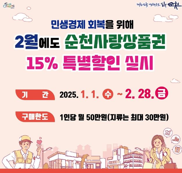 [파이낸셜경제=김예빈 기자] 순천시가 민생경제를 살리고 지역 상권을 활성화하기 위해 1월 한 달간 실시할 계획이었던 순천사랑상품권 15% 특별할인을 2월 28일까지 연장한다고 밝혔다.