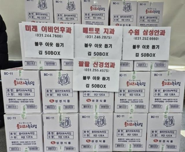 [와이뉴스] 수원시 팔달구 화서1동의 주요 병원들이 연말을 맞아 지역사회의 취약계층을 위한 따뜻한 나눔을 실천했다. 메트로치과, 팔팔신경외과, 미래이비인후과, 수원삼성안과 화서1동 관내 4개 병원들이 지난 23일 화서1동 행정복지센터에 김 400봉지를 기부했다.